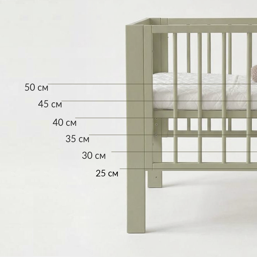 6 уровней дна (высота указа он пола до дна): сразу после роддома комфортно установить самый верхний уровень, так вам не придется сильно "нырять в кроватку" чтобы достать или положить малыша, потом просто опускайте уровни дна по мере роста малыша. Если вы планируете использовать кроватку, как приставку, подберите нужную высоту к вашей кровати, не забудьте учесть толщину матрасика